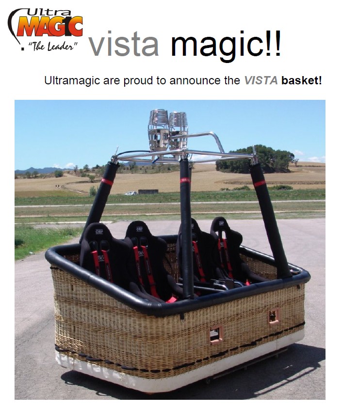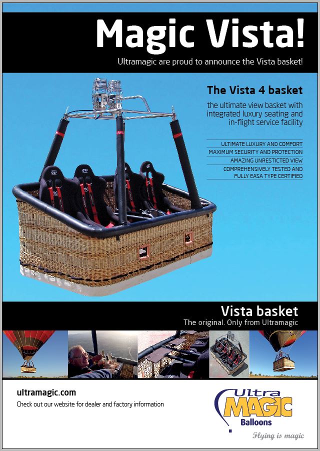 Und wieder einmal hat Ultramagic die Nase vorn. Der neue VISTA Korb ist nun EASA zertifiziert! Sehen Sie selbst, welche Möglichkeiten der neue Korb bietet. Hier geht es zum Flyer: |