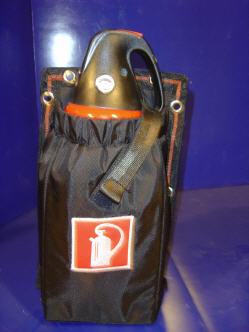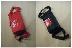 Stabile, gepolsterte Tasche für 2 Kg. Feuerlöscher. In Rot und Schwarz ab Lager, andere Farben auf Anfrage. Komplett oder ohne Löscher lieferbar. |